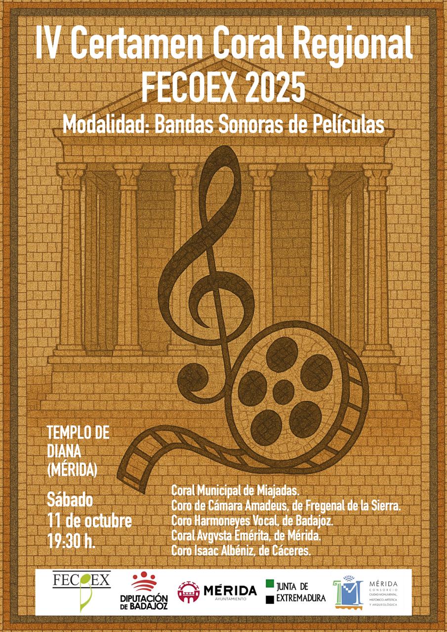 El pasado sábado 11 de octubre tuvo lugar, en en el incomparable marco del templo de Diana, en Mérida, el IV Certamen Coral Regional FECEOX 2025, en la modalidad de Bandas Sonoras.